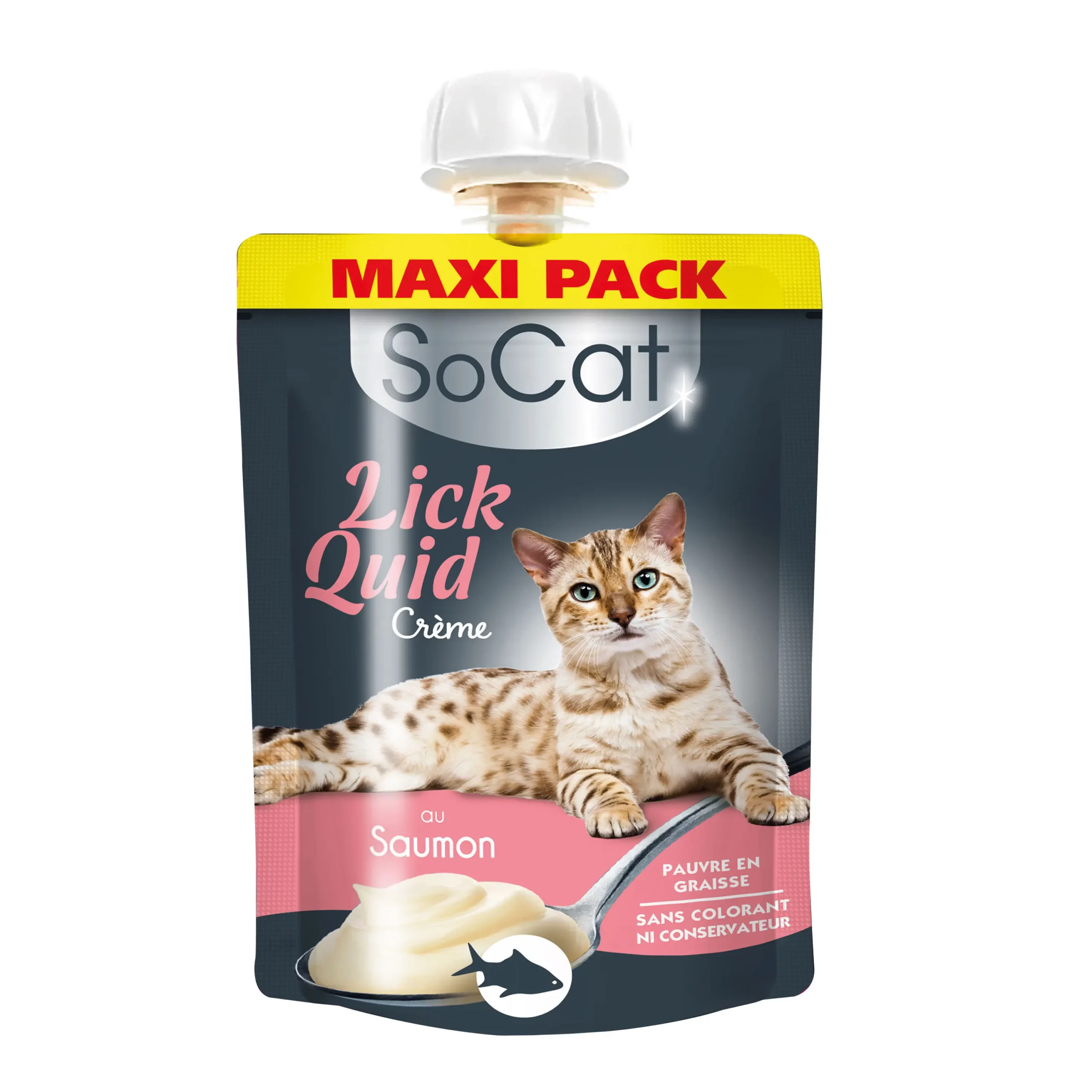 SoCat Lick quid au saumon est une friandise appétente et ultra‑gourmande, pensée pour faire plaisir à votre félin chaque jour. Sa texture crémeuse séduit tous les chats, des plus jeunes aux plus âgés. Formulée sans colorant et conservateur et pauvre en graisse, elle offre une gourmandise onctueuse simple et saine que les boules de poils adorent savourer.